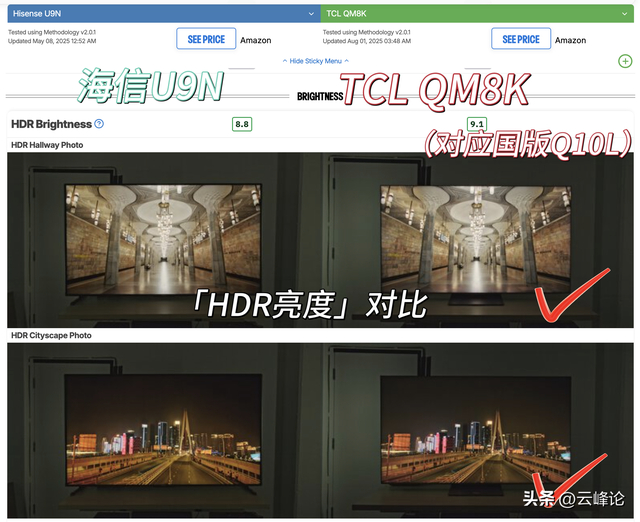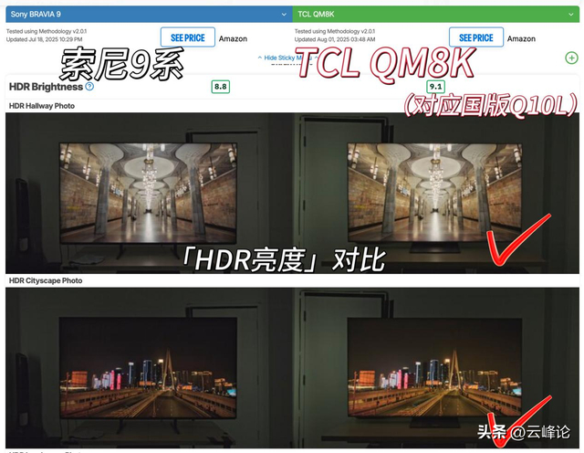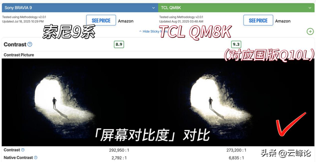 首先,在控光能力实测上,TCL QM8K在屏幕均匀性和光晕控制上的表现非常出色,可以看到画面不仅黑得深邃,而且发光物体的周围基本看不到光晕,Rtings对TCL电视的控光评分几乎也是接近满分,评分甚至达到了9.9分,远超索尼9系的8.1分和海信U9N的7.9分。而这主要是因为它搭载的万象分区技术,从背光到成像的全链路优化,带来一区顶多区的控光效果,在控光这块,TCL的技术确实有两把刷子。