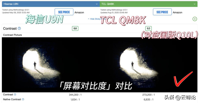 此外,对比度作为衡量画质的核心指标,直接决定了画面的明暗层次与色彩表现力,而在对比度实测方面,TCL QM8K搭载的高对比度屏原生对比度接近7000:1,评分更是高达9.3,带来远超其他产品的画面细节。不仅如此,作为目前华星HVA屏最高配版的蝶翼华曜屏,还具备超广视角与超低反射率等优势,无论是白天强光还是夜间暗场,画面均能保持纯净通透。