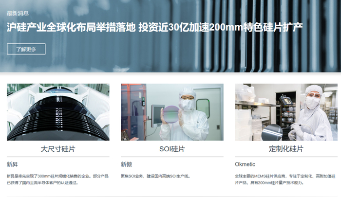 打开沪硅产业官网首页,映入眼帘的是一条关于“沪硅产业投资近30亿元加速200毫米特色硅片扩产”的最新消息。页面下方,清晰展示了新昇、新傲和Okmetic三家企业的产业业务内容——这些正是沪硅产业近年来在资本市场的收购成果。