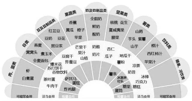 肉蛋类、谷类、豆及豆制品、果蔬类、奶及奶制品、坚果类、薯类、饮料、糖果冷饮类。