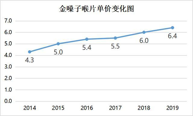 涨价不断,难掩没落!有业内资深人士向卫士蓝高端猎头透露,金嗓子的主力产品金嗓子喉片,在2014年至2019年之间不断涨价,已经从原来的4.3元涨至6.4元,涨幅已近50%。