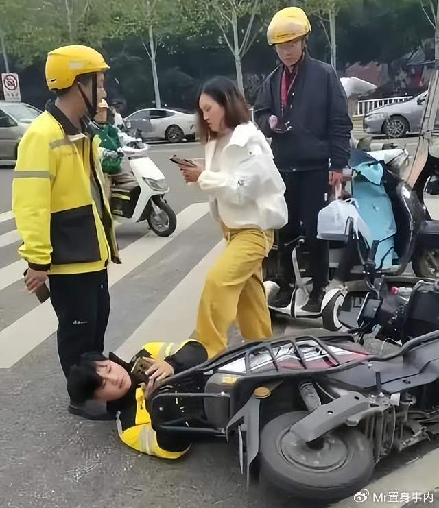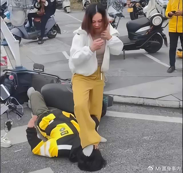 没想到该女子越劝越来劲,不但没有停手,反而用脚踩在了已经倒地的外卖小哥的头上,还反复摩擦。