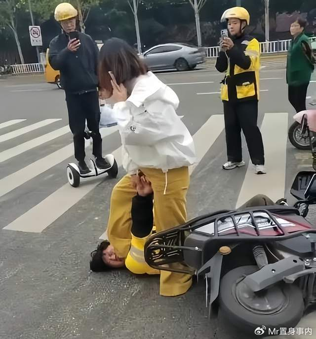 画面中,一名外卖骑手被一名女子按在地上暴揍。