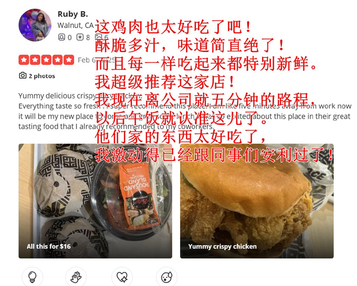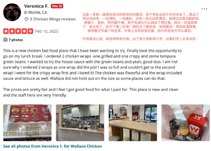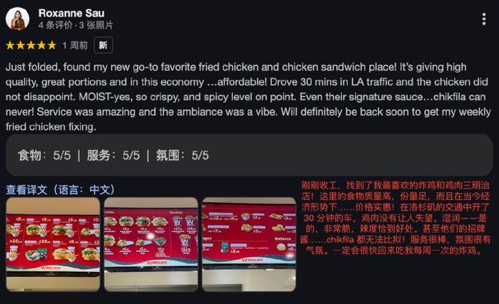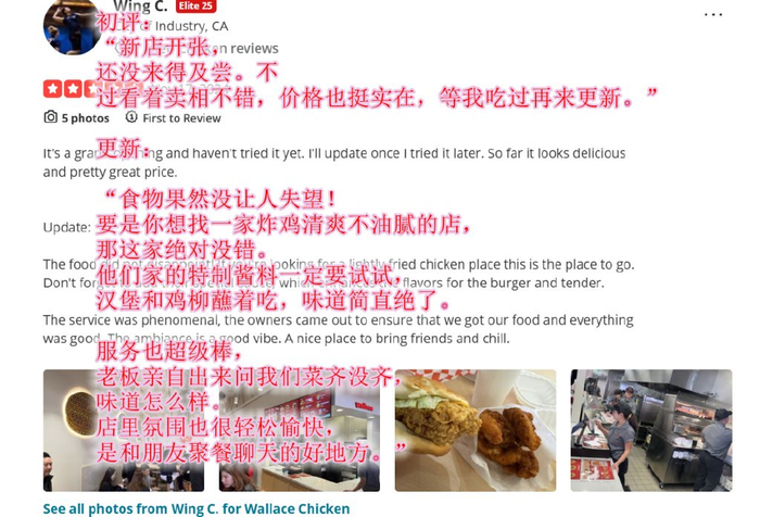 在美国人的食评平台——yelp上,对于华莱士的评分不算低,而且从评分的用户头像和口吻来分析,是有非华裔居民的各种五星好评。