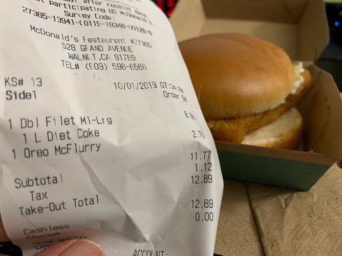 买个1 个大双层鳕鱼堡 、一杯中可以及一份麦旋风加上税是12.89刀,这都快能买华莱士近一半的餐品了。