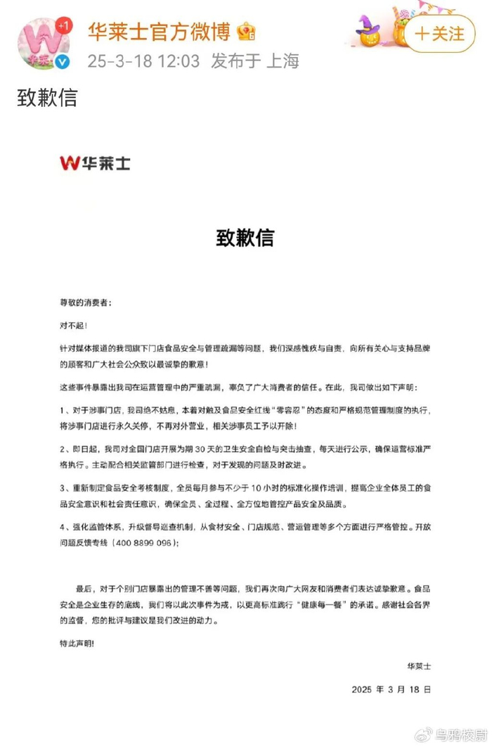@华莱士官方微博 在致歉信中表示,涉事门店永久关停,涉事员工予以开除!全国门店开展30天的卫生自检、抽查。