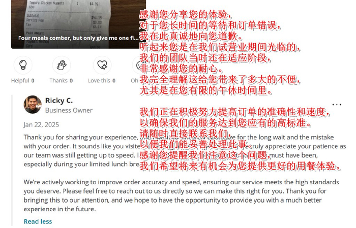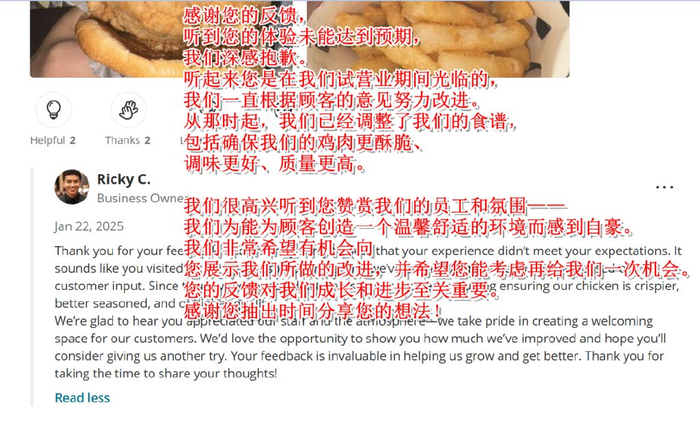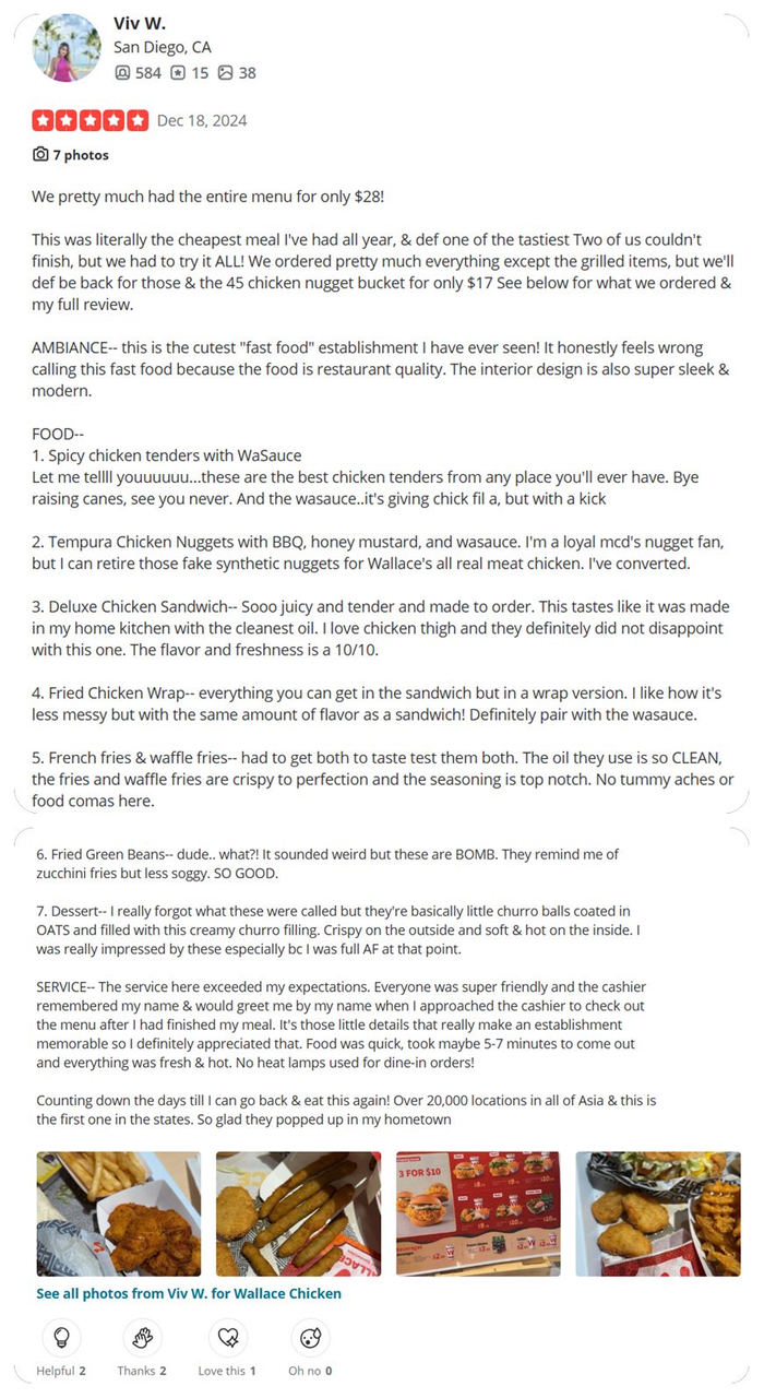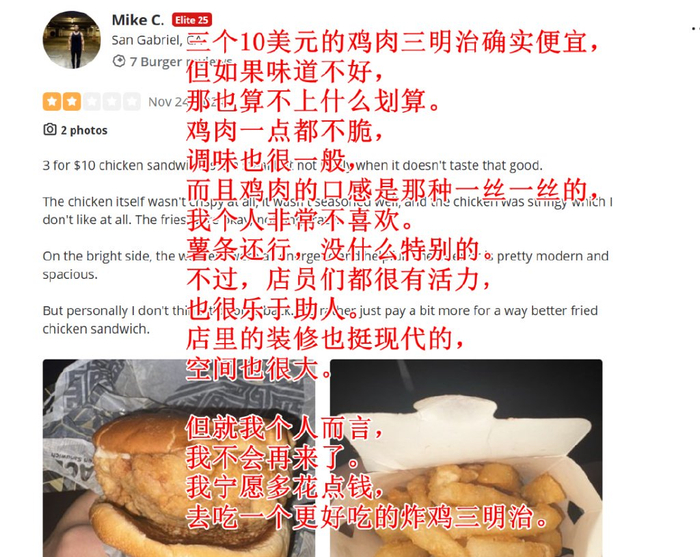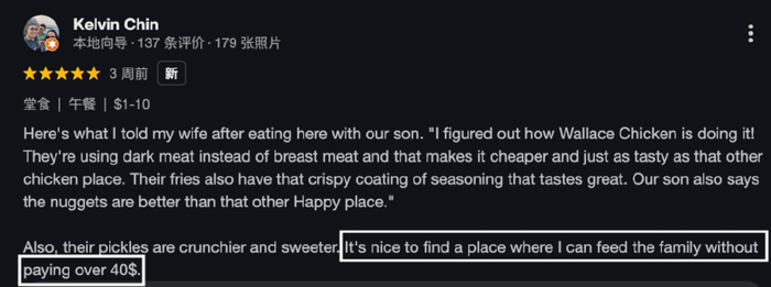 再来看一条超长好评。这位大姐的评价恐怕至少是商家应该给出八折优惠的水平,她强调了28刀就吃完了菜单上所有食物,并逐一做点评,强调这是当地最便宜的,而且她还强调这家店在中国开了两万家,一定很有名(但大姐却对华莱士在中国“喷射战士”威名一无所知?)......