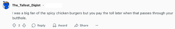 “我非常喜欢辣鸡肉汉堡,但当它穿过你的屁眼时,你就得付出代价了。”