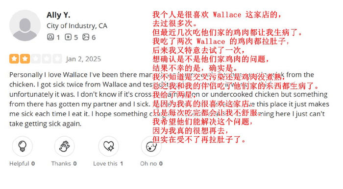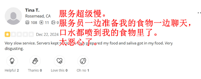 当然,跟国内对华莱士体验两极分化同样的是,美国消费者有好评也有差评,而且差评的焦点也是熟悉的“喷射战士”,不如这条2星评价可以看出来这是个铁杆粉丝,去过很多次,终究还是“喷射”了,而且是夫妻(或情侣)两个双双中招。