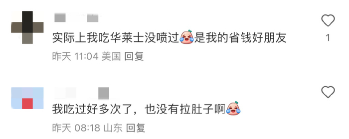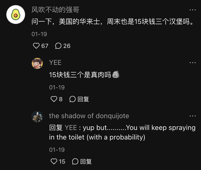 有意思的是,一些中招喷射的老外甚至会在中国社交软件上分享心得,比如这位,是先是肯定是汉堡的价格,再隐隐吐露了自己屁股的状况。