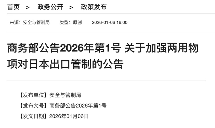 商务部:《商务部公告2026年第1号 关于加强两用物项对日本出口管制的公告》