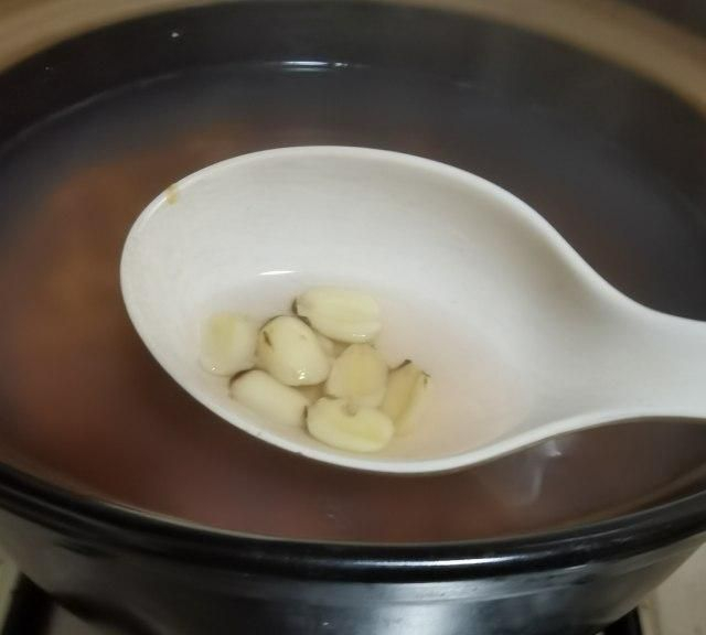 第3步、浸泡好的莲子捞出,加清水、两片姜,开火煮。