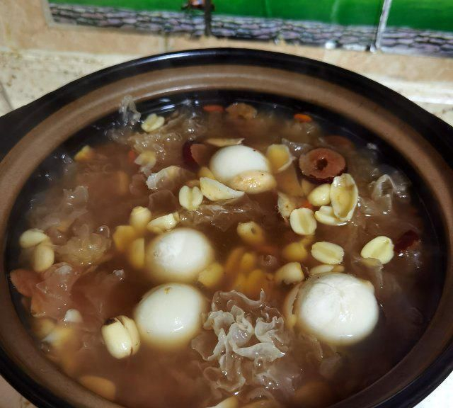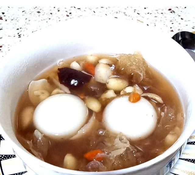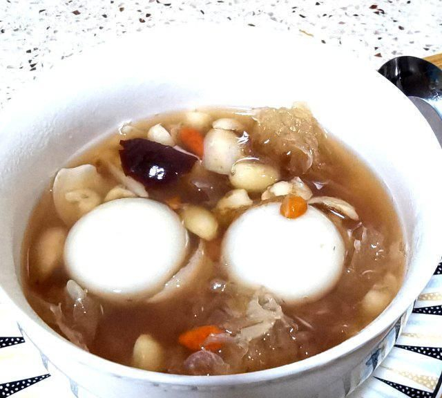 原料:干莲子、干百合、干银耳、红枣、枸杞、汤圆、冰糖、姜。