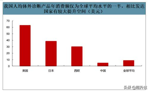 对比欧美发达国家,我国IVD行业仍处于发展前期,渗透率有非常大的提升空间。我国人口约占全球的1/5,但体外诊断市场规模仅为全球的3%。我国体外诊断产品人均年消费额为4.6美元,仅为全球平均消费水平的一半,有较大的提升空间。