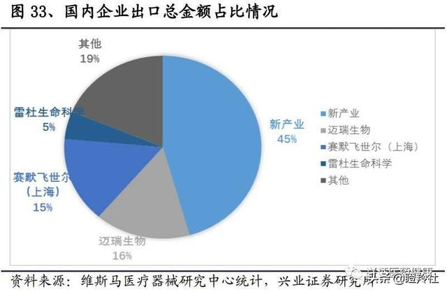 在国外市场,新产业有海外经销商220余家,进入143个国家和地区,分布于亚洲、欧洲、非洲、美洲等主要大洲。公司仪器出口收入占到总收入近一半,试剂出口收入占到10%左右。2016年出口总额为国内第一,占到总金额的45.6%。