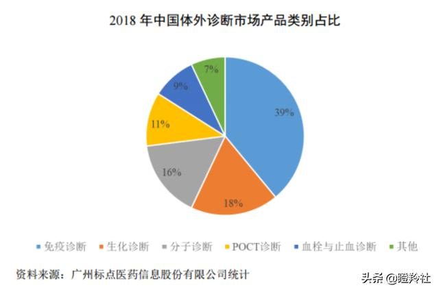 根据Allied Market Research预测,国内体外诊断市场规模最近三年增速接近20%,预计未来仍将继续增长。目前体外诊断主流的三种技术分别为生化诊断、免疫诊断和分子诊断,而免疫诊断目前是体外诊断市场份额最大的细分领域,占体外诊断市场比重达39%。