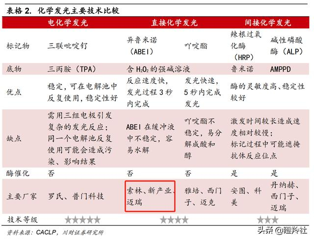 1、技术研发实力:化学发光技术在市场上应用较广泛的有三种,分别是电化学发光、直接化学发光、间接化学发光,前两种由于避免了酶的催化发光有效提高了反应速度。虽然这三种方法学存在一定差异,但在医院在终端使用时灵敏性和特异性比较起来差别不大,而终端更多考虑的是仪器稳定性、操作便携程度和反应速度,在产品的竞争上暂时不存在技术之间的相互替代。