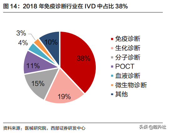 ● 化学发光是IVD大赛道中占比最大的市场:根据医械研究院统计,2018年国内体外诊断市场规模在600亿元以上,行业增速在18%左右。免疫诊断是IVD最大的细分领域,2018年占比约38%。