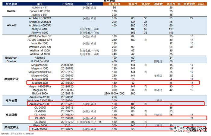● 高端机型比较:在高端主力机层面,亚辉龙iFlash3000系列主要性能的单机测试速度、样本位、试剂位等指标已经媲美进口厂商,但总体上在测试速度和效率上略劣于新产业和迈瑞的主力机。