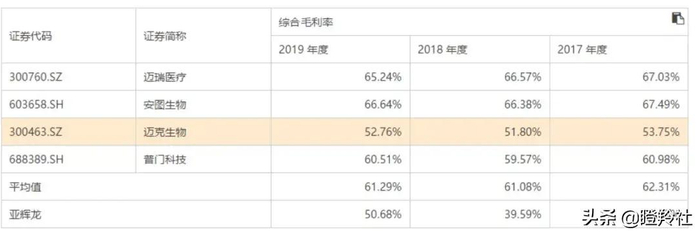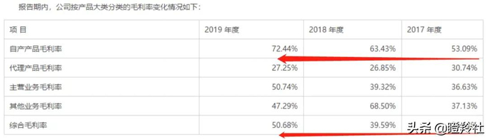 更有参考价值的是,2017-2019年公司自产产品销售毛利率为53.09%、63.43%和72.44%,同样保持上升趋势。与同行业竞争对手比较,综合业务水平参考价值偏弱,通过自产业务毛利水平比较,公司整体处于行业中上游水平。