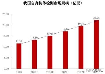 预计到2023年我国自身抗体检测市场规模在22.28亿元左右,2018~2023年复合增长率在14%左右,市场空间不俗。