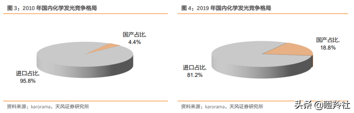 国产发光行业历经2010-2019年的变迁,国产厂商的市场地位已经有了非常大的飞跃,从2010年几乎空白市场, 到目前接近20%占比,可以看到国产替代的空间仍然巨大,目前最大的国产化学发光公司约为 6%市占率,前三家国产占比已超过15%。
