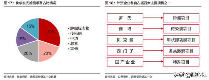 目前,化学发光的主要检测项目为传染病、肿瘤标志物、甲功、激素,合计占约 80%以上。外资巨头厂商各自不同细分领域建立了行业的“金标准”,国产企业在这些大项目上与外资企业正面竞争比较困难。