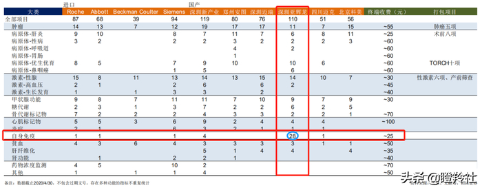 当前,国产企业为与强势的外资竞争,逐渐形成了不同的竞争思路。亚辉龙作为后来者采取了主攻一些特殊项目,做进口品牌的补充,在高等级医院建立品牌效应后逐渐向主要检测项目布局,其中亚辉龙最具备优势的无疑是自免检测领域,为其赢得了不少的三级医院的装机量。