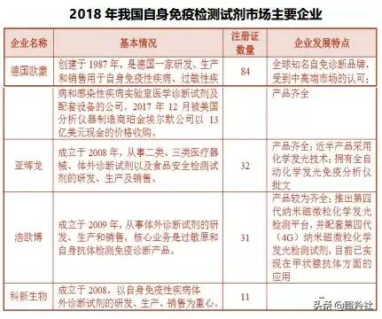 目前国内自免诊断市场被进口产品为主导,欧美进口产品发挥先发优势,借助中国风湿免疫学科的快速发展,几乎占据了我国自免诊断市场。但2010年以后,国内企业奋起直追,进口品牌的独家垄断地位被打破,其市场份额逐渐从将近100%,跌落到75%至80%,当前这个趋势仍在延续。国内涌现了一些优秀的自免诊断厂商,代表厂商有亚辉龙、浩欧博、科新等。