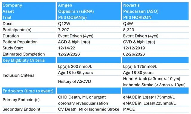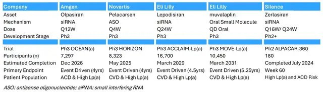 从目前管线进度和竞争格局来看,诺华ASO疗法Pelacarsen将在在2026H1公布三期临床数据,而安进的Olpasiran的三期研究有望在2026H2公布。