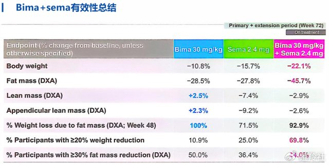 2025 ADA最新披露Bima+司美格鲁肽联合治疗组在第72周实现减重22.1%(92.9%来自于脂肪),肌肉只损失2.9%。