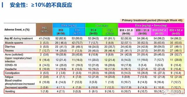 从Bima在2025 ADA大会公布的BELIEVE研究安全性看,与Bima相关的主要安全性是肌肉痉挛、腹泻和痤疮,而与司美相关的则是恶心、腹泻、便秘和疲劳,在联合治疗组中恶心、腹泻、痤疮等不良反应率有显著提升,这也使得该研究中有9%的受试者因不良事件在72周期间内停止了治疗。