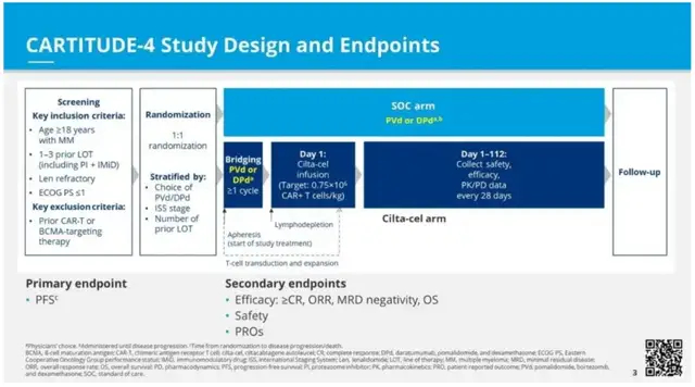 同样针对中位治疗线数为3线的RRMM患者,传奇生物Carvykti可参照的注册临床是CARTITUDE-4研究,这项研究同样对照组是DPd/DVd方案,主要终点和次要终点与Majestec-3研究高度一致。