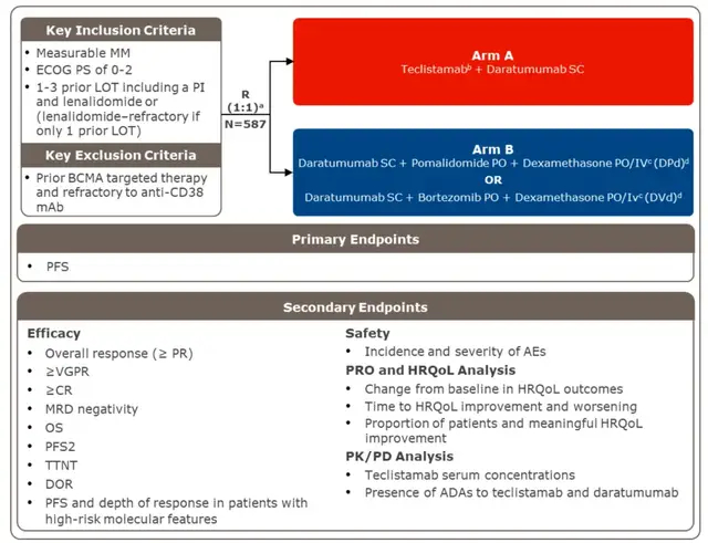 Majestec-3研究针对既往治疗线数1-3(即治疗线数2-4线)的RRMM患者,包含一种蛋白酶体抑制剂和来那度胺,本次入组将接受过靶向BCMA治疗和CD38难治患者排除在外,接受过一线治疗的患者须来那度胺耐药,允许患者接受过抗CD38治疗。研究共入组587例患者,1:1随机分配到Tec-Dara组和DPd/DVd方案组,患者既往治疗线数为2(即3线RRMM患者)。值得一提的是,对照组DPd/DVd是当前RRMM公认的、指南推荐的核心常规三联治疗方案。