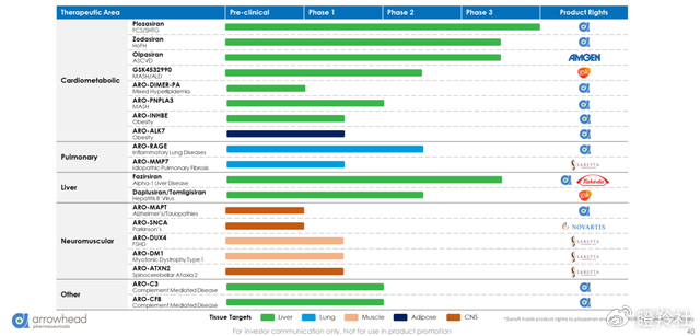 从合作模式上看,好的小核酸技术平台管线授权呈现集中交易化,以Arrowhead为例,其管线合作伙伴包括了安进、GSK、诺华、武田和Sarepta。