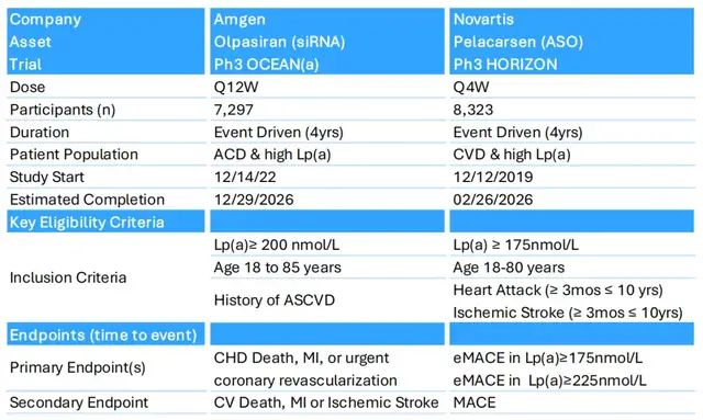 据临床进度,诺华ASO疗法Pelacarsen将在在2026H1公布三期临床数据,而安进的Olpasiran的三期研究有望在2026H2公布。