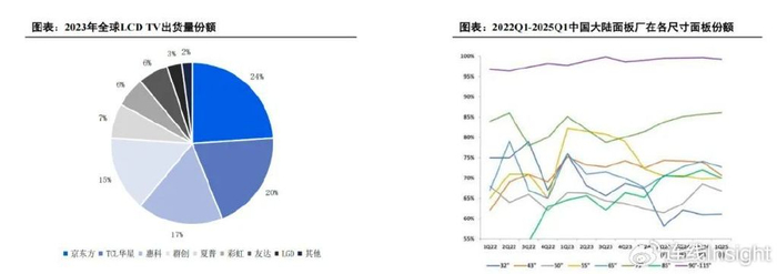 以一组数据为例:到目前,中国大陆面板厂已经掌握全球约70%的LCD产能,其中TCL和京东方两家,共同占据了全球近半市场份额;2024年上半年,中国大陆厂商也追平了韩国面板厂商AMOLED智能手机面板出货份额。