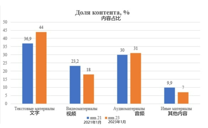 从2021年开始,激进分子的网络“宣传工作”强度增加——主要是文字内容。视频内容份额下降近5%,音频内容所占份额最为稳定,约占所有过滤内容的三分之一。