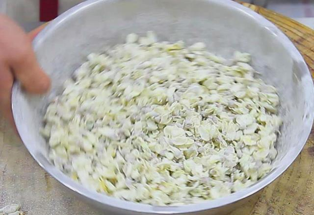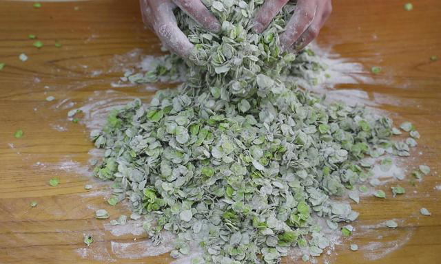 3、然后把控干水分的楮不揪倒入盆中,加入植物油10克拌匀,植物油能防止楮不揪大量出水,影响口感卖相,加入面粉50克,抓拌均匀,使楮不揪均匀裹上面粉。