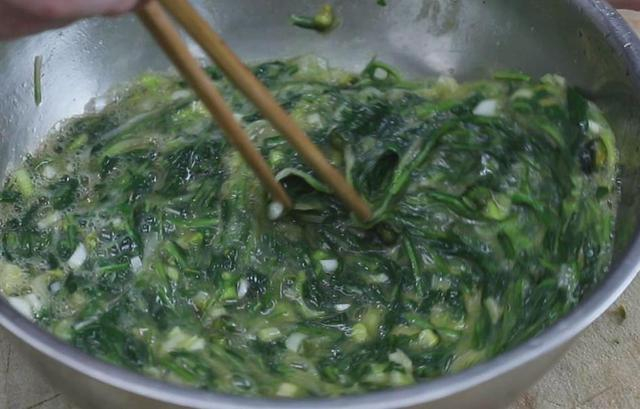 4、大葱一根,切碎成葱花,控过水的蒲公英放手里挤一挤水分,以免蒸的时候水分过多。挤完水分和葱花放一起,剁碎。不要太碎,不然吃起来没口感。
