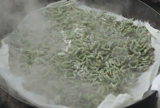 4、锅内烧水,放上篦子,大火把水烧开,在篦子上铺上白细布,把裹好面粉的楮不揪均匀撒在篦子上,中火蒸8分钟,8分钟以后,楮不揪已经蒸熟,把楮不揪从锅中取出。