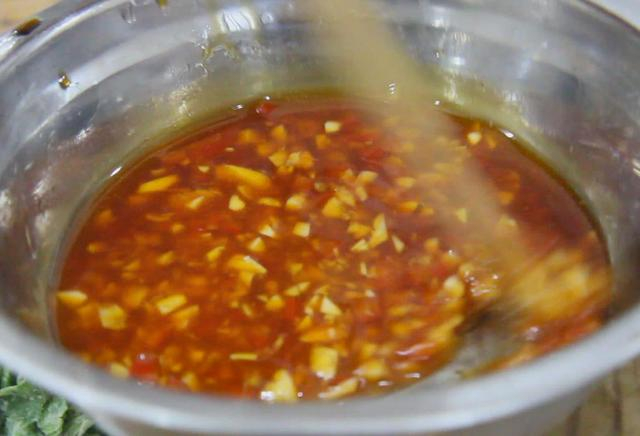 5、我们再做一下调料汁。大蒜拍扁后,切成蒜沫,红椒一小片,切成沫配色,倒入辣椒红油,芝麻香油,生抽,搅拌均匀后,浇在芹菜叶上即可食用。