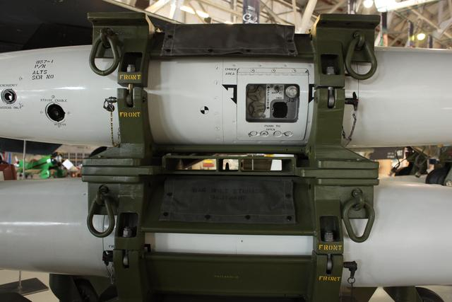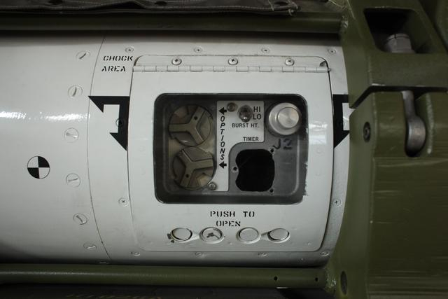 在飞机装上核弹前要通过这个窗口对核弹进行检查和设置,这里面有个可以扳动的开关设置爆炸后的输出当量分别可以在HI(高)和LO(低)两个档位转化。