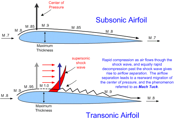 当一架飞机在跨音速飞行的时候(马赫0.8-1.2),由于飞机是一个在空气中高速运动的刚体,气流在飞机上沿着飞机表面被向着不同方向推开。