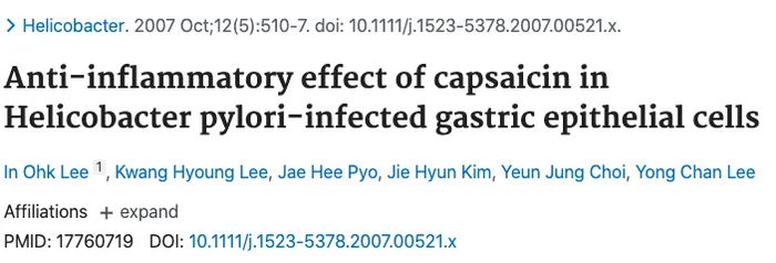 [4] [3] Lee I O, Lee K H, Pyo J H, et al. Anti‐inflammatory effect of capsaicin in Helicobacter pylori‐infected gastric epithelial cells[J]. Helicobacter, 2007, 12(5): 510-517.