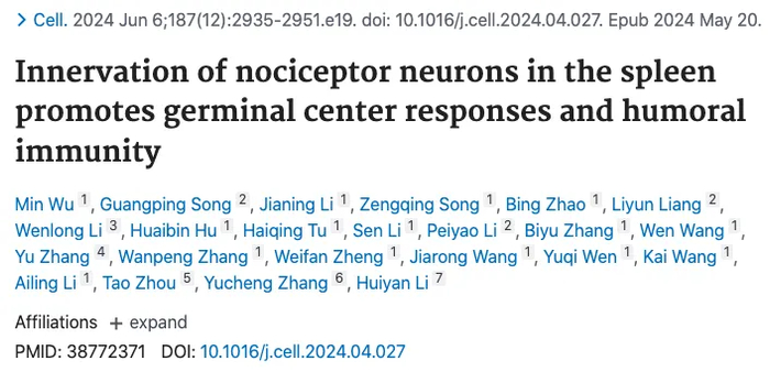 [3] [2] Wu M, Song G, Li J, et al. Innervation of nociceptor neurons in the spleen promotes germinal center responses and humoral immunity[J]. Cell, 2024, 187(12): 2935-2951. e19.