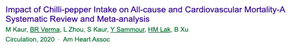 [5] [4]Kaur M, Verma B R, Zhou L, et al. Impact of Chilli-pepper Intake on All-cause and Cardiovascular Mortality-A Systematic Review and Meta-analysis[J]. Circulation, 2020, 142(Suppl_3): A12729-A12729.