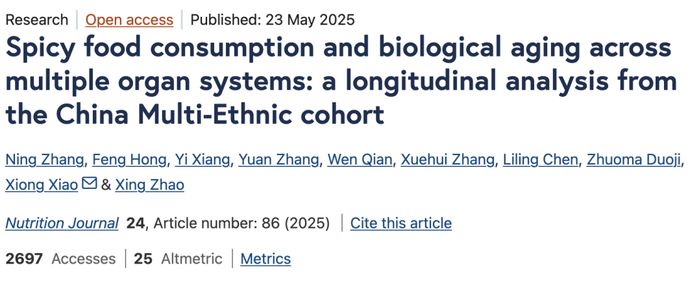 [1] Zhang N, Hong F, Xiang Y, et al. Spicy food consumption and biological aging across multiple organ systems: a longitudinal analysis from the China Multi-Ethnic cohort. Nutr J. 2025 May 23;24(1):86.
