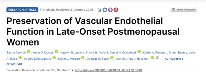 [1] Darvish S, Murray K O, Ludwig K R, et al. Preservation of vascular endothelial function in late-onset postmenopausal women[J]. Circulation research, 2025, 136(5): 455-469.