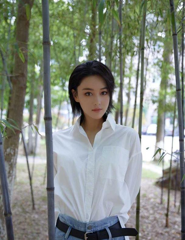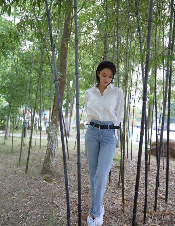 张馨予终于认真穿搭,白衬衫配牛仔裤再勒个皮带,简约高级又洋气
